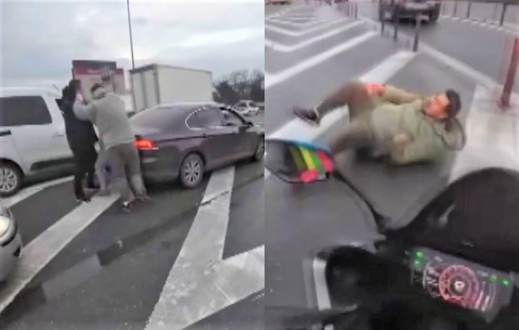 Kavga anları ve sivil polisin kavga eden iki sürücüye müdahalesi bir motosikletlinin kask kamerasına yansıdı.